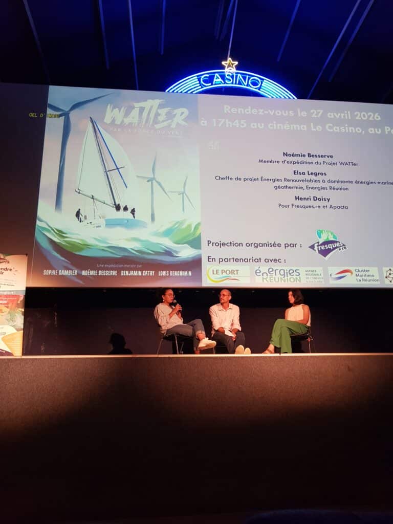 Avec une soixantaine de personnes présentes, le documentaire s’est conclu par un échange constructif et inspiré par de nombreuses questions pertinentes entre le public, Noémie Besserve, une des navigatrices de l’expédition, Henri Doisy, organisateur de l’événement et Elsa Le Gros, chargée des Energies Renouvelables à Energies Reunion.